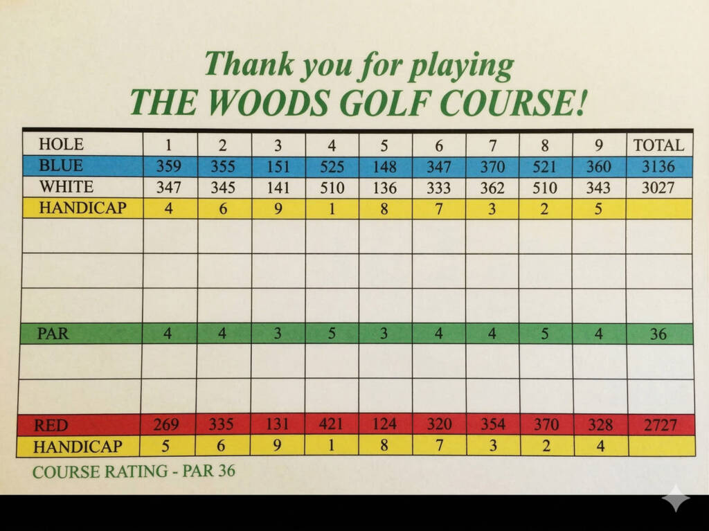 The Woods features a classic 9-hole challenge that rewards precision and strategy. Nestled among mature timber and rolling terrain, the layout remains a peaceful escape for golfers of all skill levels.
